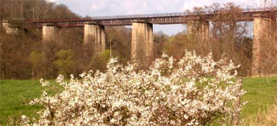 | Diese Brücke im Homberger Stadtteil Relbehausen erinnert daran, dass die Bahnlinie Berlin-Metz früher durch Homberg ging. |